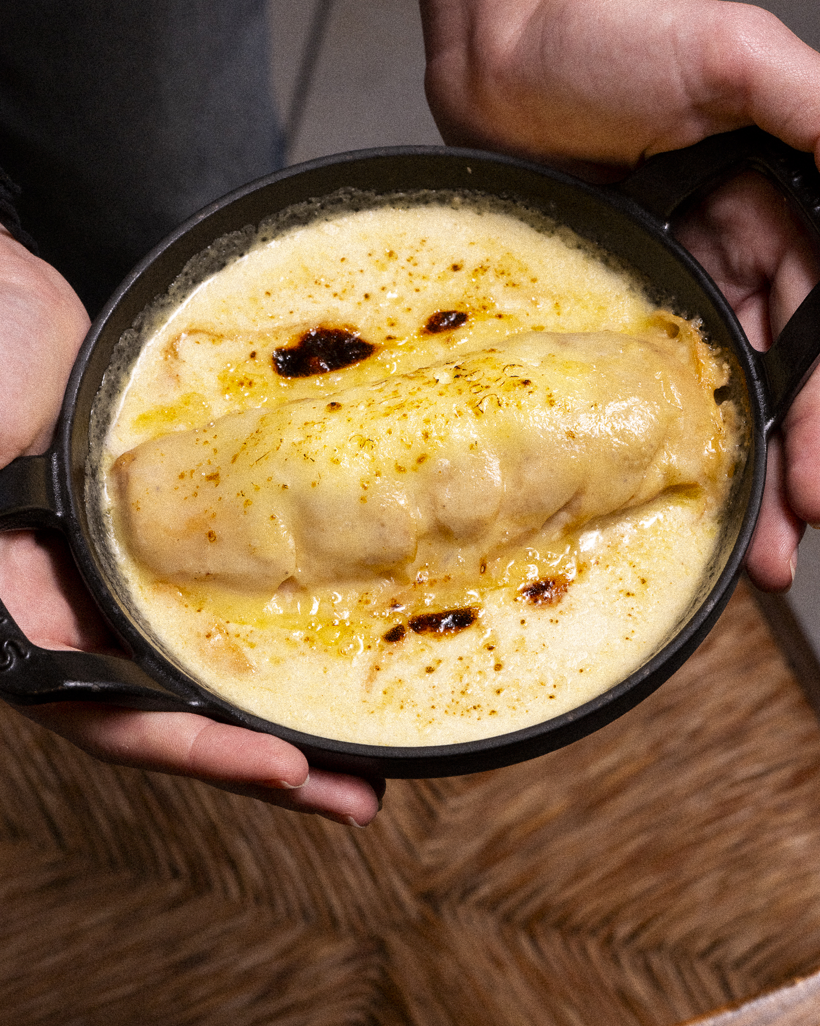 émincé de volaille jaune , gratiné au maroilles